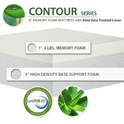 The awareness of health and hygiene has increased the demand for antimicrobial textiles. We have infused Aloe Vera Extract into 6 inch Contouring Memory Foam mattress cover. Aloe Vera protects and rejuvenates skin as well as offering anti-bacterial and anti-fungal properties. Infusing our cover with Aloe Vera creates a cleaner-softer sleeping surface. The 6 Inch Memory Foam Mattress provides contouring comfort with a memory foam layer that supports the natural shape of your body promoting proper circulation and spinal alignment. The top layer is designed with 1″ of quality 3lb. Memory Foam. The bottom layer, the base layer, is constructed with 5 inches of High Density Foam for bottom reinforcement. All of our flexible foams have been independently laboratory tested and certified by CertiPUR-US to meet voluntary standards for content, emissions and durability. This mattress is conveniently shipped to you compressed and rolled, saving you money on shipping costs while leaving a smaller carbon footprint. This mattress meets federal flammability standard 16 CFR 1633. Includes 10 Year Warranty. Please open your mattress package within 72 hours of receipt and allow 48 hours for your new mattress to return to its original shape.