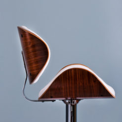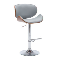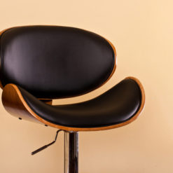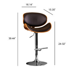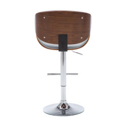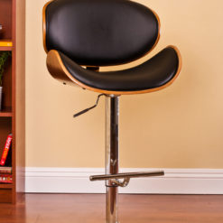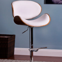 Contemporary style can be part of any dining or bar area with this wonderfully crafted barstool. Featuring a curved, walnut finished frame and either white or black upholstered matte leatherette cushions, this barstool’s look is completed with a bar footrest and adjustable polished chrome pedestal base.