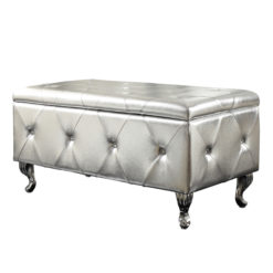 Add elegant extra seating and convenient storage to your sitting room or master suite with this tufted storage bench. Made with a durable hardwood frame and supple bonded-leather upholstery, this opulent piece is built to last. An ideal accent to your traditional decor, this storage bench features delicate crystal-like accents for a hint of sparkle.